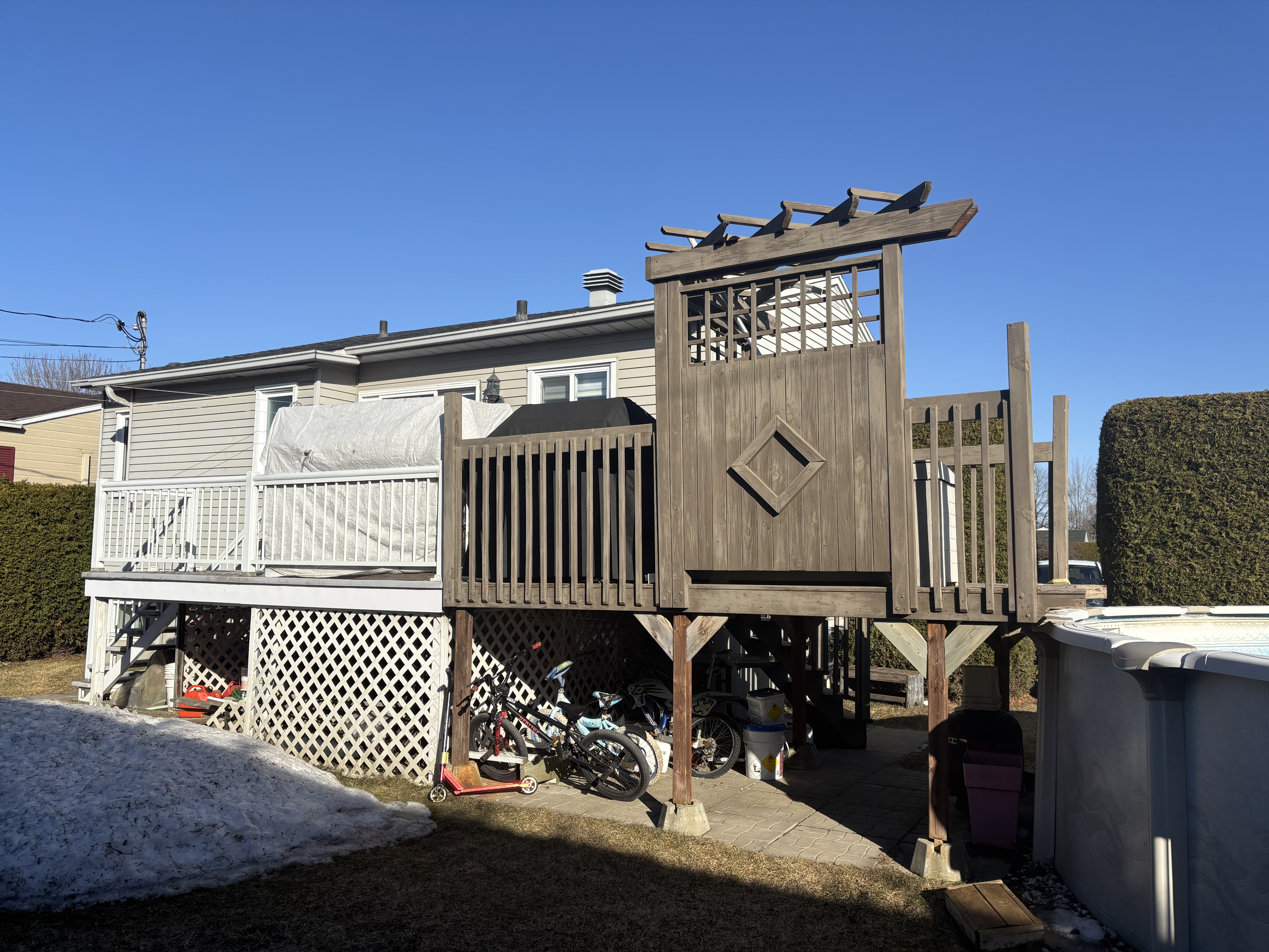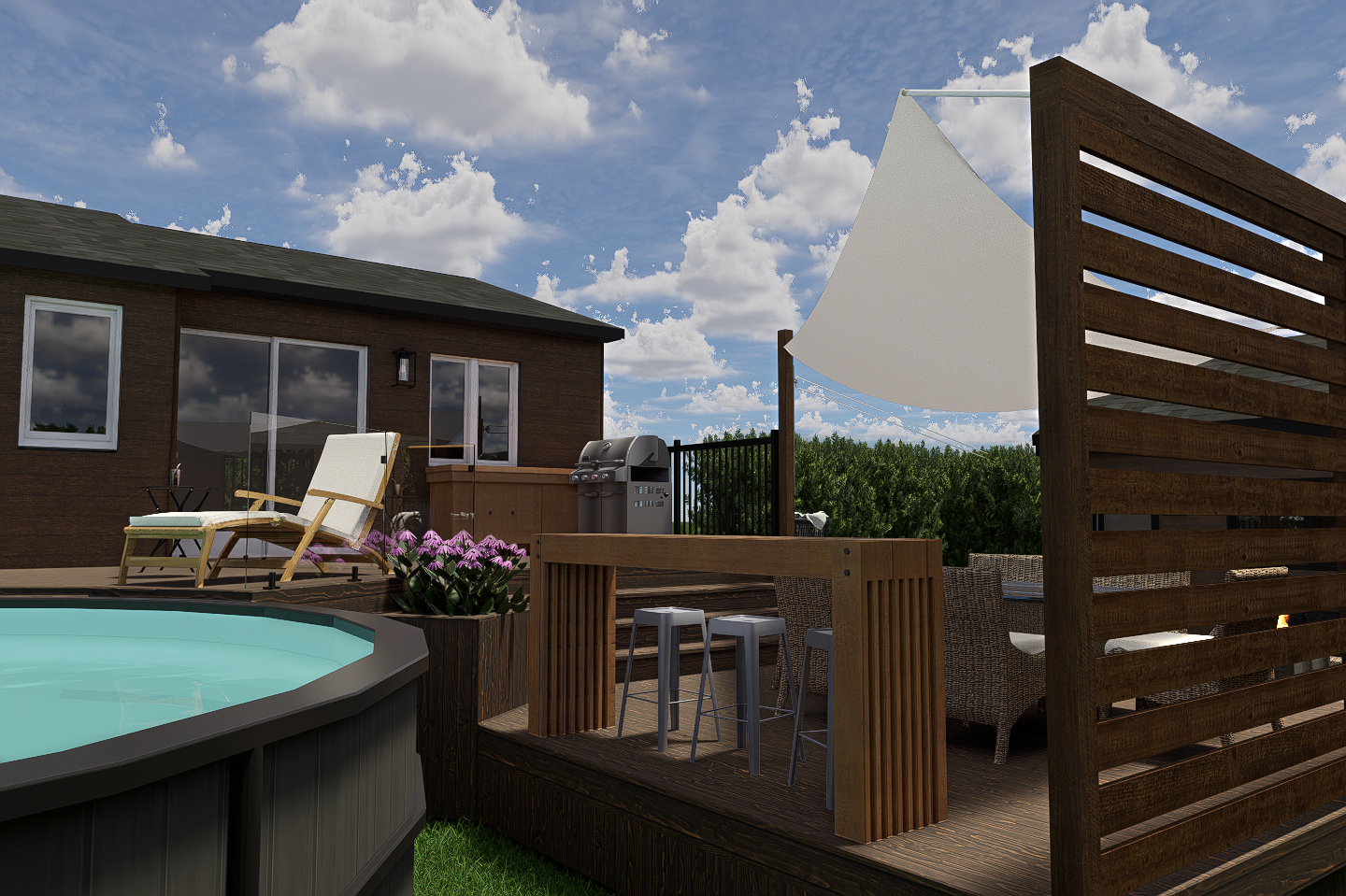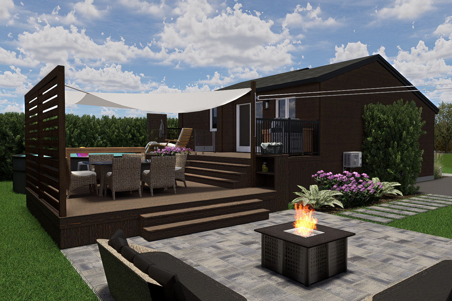 Ce projet à Lavaltrie illustre la transformation complète d'une résidence existante — façade, arrière-cour et aménagements extérieurs repensés pour créer une cohérence visuelle d'ensemble.