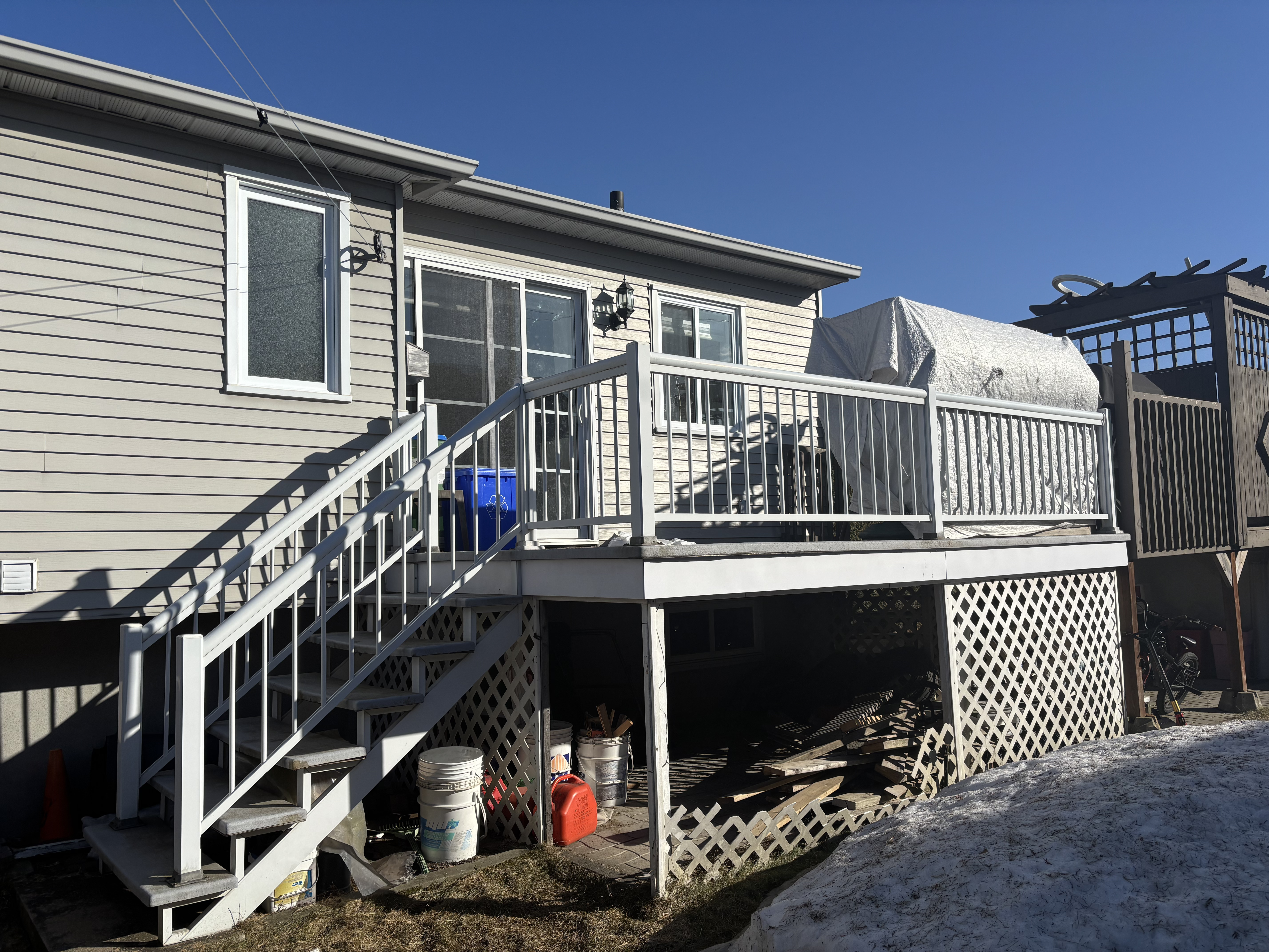 L'arrière de la propriété a été entièrement réinventé avec l'ajout d'un balcon structuré et d'un espace repas extérieur, offrant deux zones de vie distinctes mais complémentaires.
