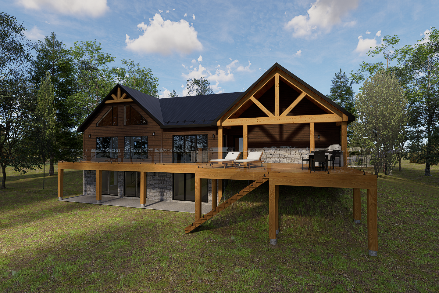 Ce projet d'agrandissement et de rénovation à St-Michel-des-Saints a complètement métamorphosé ce chalet contemporain en un lodge de montagne à inspiration Timber Frame au caractère fort. Le bardage en bois brun foncé agencé à l'existant, le toit noir et les imposants éléments de bois naturel ajoutés donnent au chalet une nouvelle identité architecturale cohérente et affirmée.