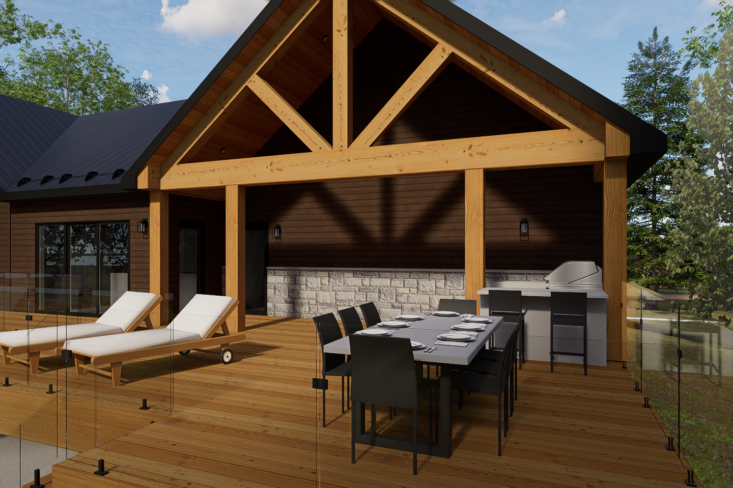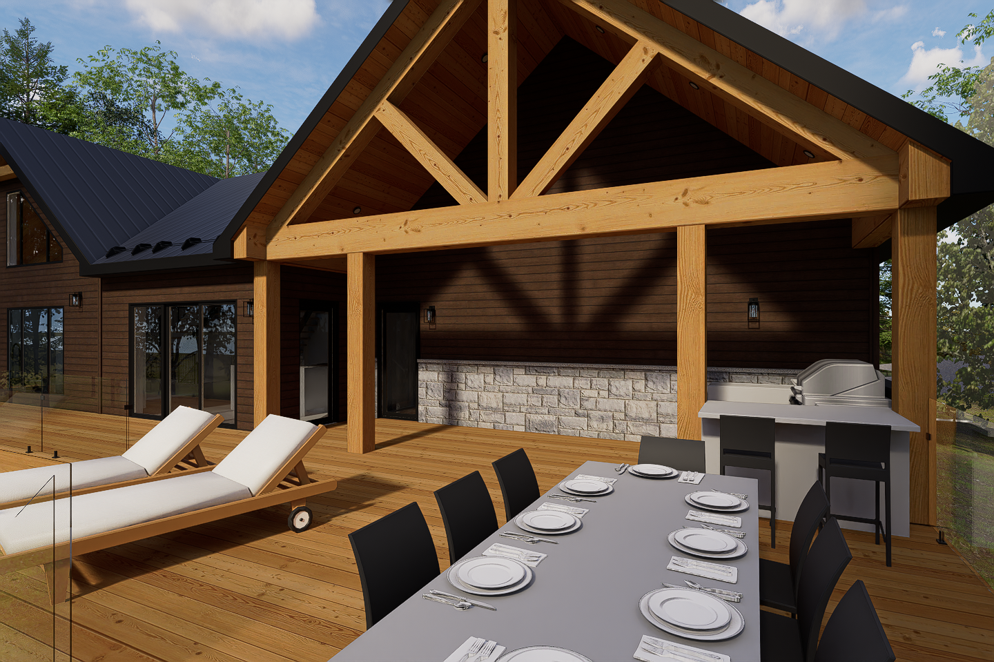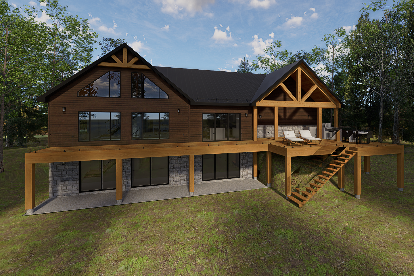Côté lac, une grande terrasse surélevée en bois a été ajoutée sur toute la largeur, créant un espace de vie extérieur exceptionnel, avec coin salon, coin repas et même, une cuisine extérieure couverte.